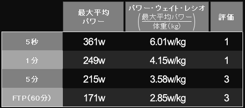 レースの強度指標の基本になる5秒、1分、5分、20分という4つのゾーン毎の最大平均ワットを記録してもらいます。最大平均ワットを体重で割り、プロファイリングチャートを参照にして相対的に数値分析すれば、現在の能力、長所と短所がハッキリします。それぞれのゾーンの数値で以下のことが分かります。