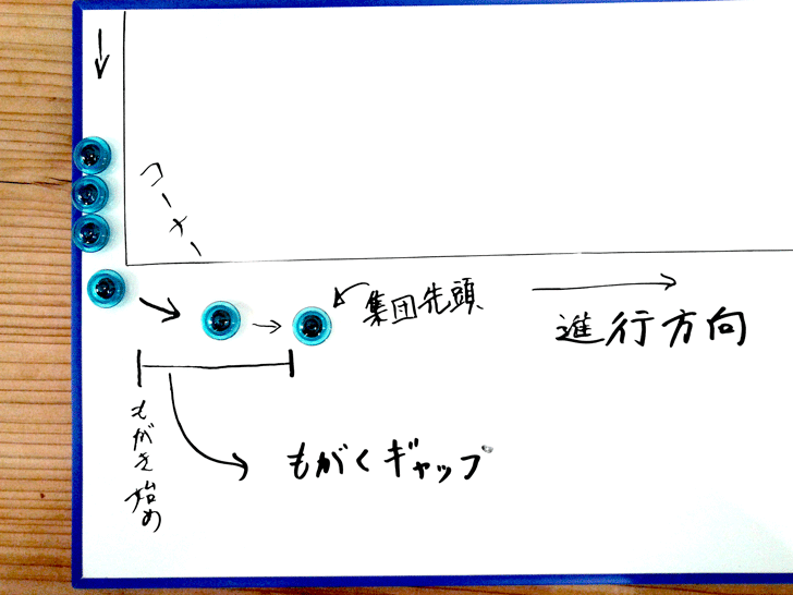 ギャップを埋めるための動きは2番手の選手と同じですが、3番手の選手は前の2番手の選手の作ったギャップと自分の作ったギャップの分だけもがかなければなりません(下図を参照)。